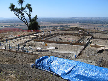 With the grade-beams poured and the ditches filled in, the house plan now starts to make better sense. We are looking down at the house from the east. The area directly in front is the laundry room/dressing room area, with the master bath going out of the picture to the left. Directly behind the laundry room wing is the courtyard. They have formed up the footings for the courtyard sidewalks—although they won’t pour the sidewalks themselves until construction is much further along. Behind the courtyard is the living room/dining room wing. |