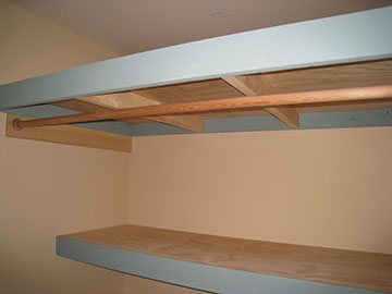 Kai will be on vacation next week so he has been working very hard to finish the closets, so the painters can get to them while he is gone. These shelves are in my closet. This is my tall pole with a high shelf above it for stuff—of which I seem to have a lot! The two shelves behind the clothes pole are also for stuff. |