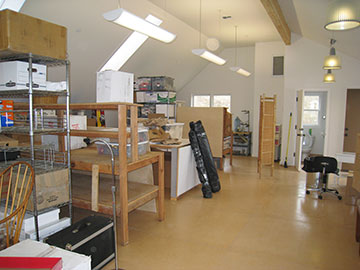 Here is my studio in the barn after everything was moved in from our basement in the old house. As you can see, it is pretty crowded. I have started to unpack and get things organized but have discovered something rather disturbing. Although we have had the floor finished for months, it is still off-gassing severely. In fact, with the windows closed, the smell is so overwhelming that in about 15 minutes, I start to taste it. I had noticed the smell before, of course, but before the AC was connected, we had a habit of leaving the windows open a lot, and so the smell wasn’t as apparent. |