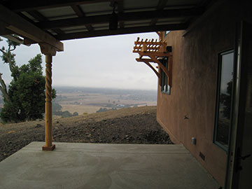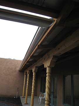 I took this picture of one of the double corbels on the veranda so you could see the checking in the wood (the large cracks.) All the pine in the courtyard and veranda will continue to check a lot because it was green wood when it was worked. The sheet metal contractor’s assistant thought the checks were deliberate saw marks to give everything authentic flavor, so I had to set him straight on that! |