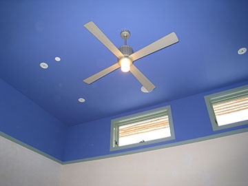 Back inside, our bedroom ceiling fan is finally operational with the light working too. You can't see in this photo, but the light cover is fluted to match the motor-cover of the fan—very handsome. This is also a great shot of the latilla shades on the clerestories. | |