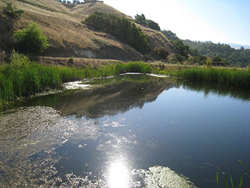 The pond is starting to look a little scummy, although some of what you see on the surface is actually pond plants—duckweed et al. |